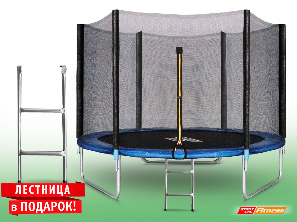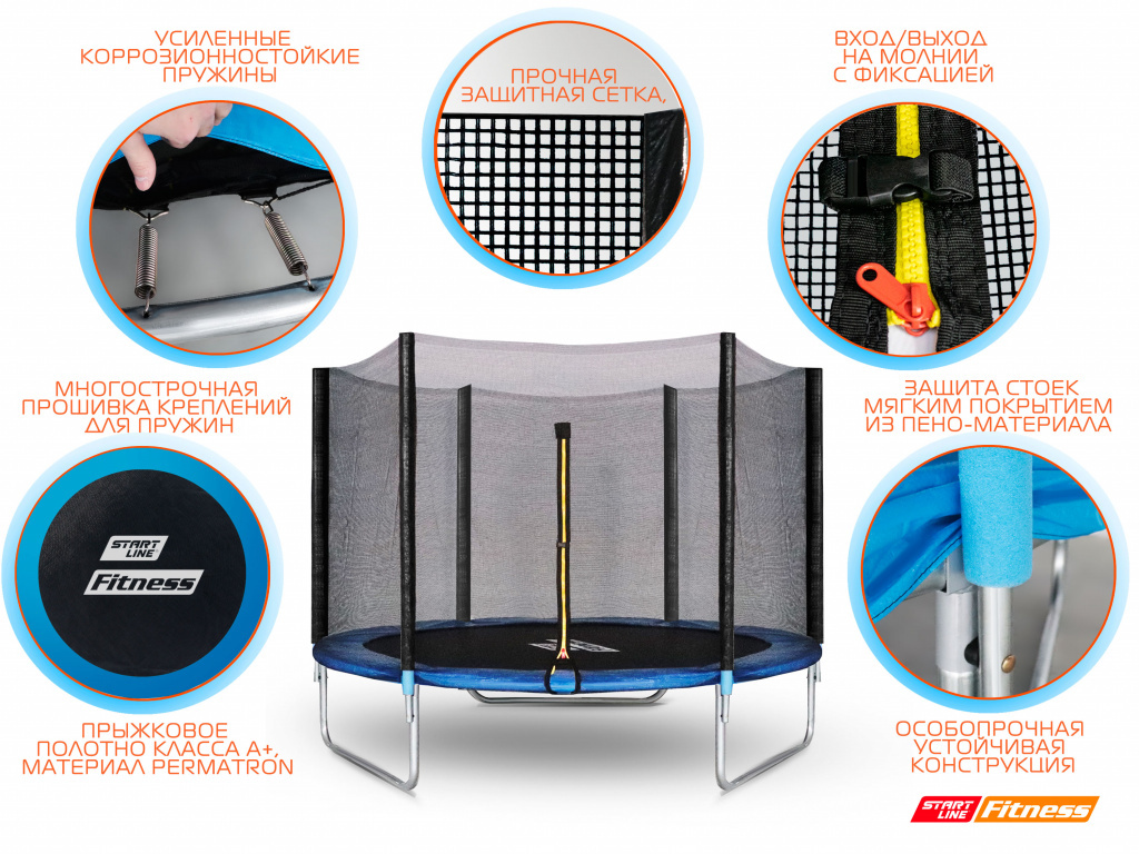 Батуты прекрасно подходят для использования как взрослыми, так и детьми. Могут быть размещены в домах, на дачах, во дворах, а также в парках и на пляжах. При производстве батутов уделяется особое внимание качеству. Даже на самом маленьком по диаметру батуте используется 60 пружин, это увеличивает высоту прыжка. Поверхность для прыжков выполнена из самого прочного полипропилена последнего поколения Перматрон. Пружины выполнены из высококачественной стали, которые имеют повышенную защиту от износа и растягивания, тем самым позволяя продлить срок службы батута. Для обеспечения безопасности пружины закрыты защитным чехлом. Внешняя защитная сетка #40;в комплекте#41; обеспечит безопасность от случайного падения. Сетка изготовлена из высокопрочного нейлона, надежно крепится к стойкам батута. Для защиты вход/выход через сетку выполнен на молнии с фиксирующими защелками с внешней стороны. В комплекте с батутом поставляются ключи для сборки, лестница и подробная инструкция.