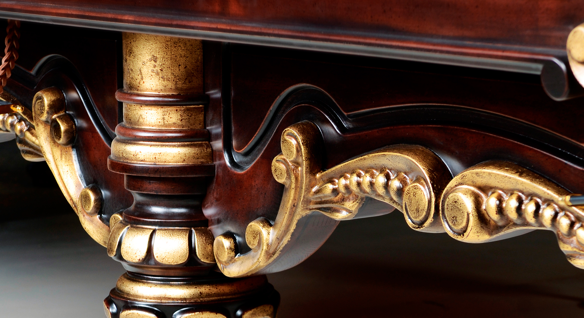 Бильярдный стол «Император-Люкс», украсит любые апартаменты. Резные узоры на лафете из натурального дерева, качественный сланец игрового поля, лучшие сукно и бортовая резина. С художественной точки зрения подлинным произведением искусства «Император-Люкс» делает выкраска. Шикарная отделка элементов стола поталью, по старинной технологии золочения. Ритм золоченых элементов объединяет резьбу ручной работы. Авторское патинирование и семь тонких слоев лака придают золоту глубину, а древесине благородный вид.