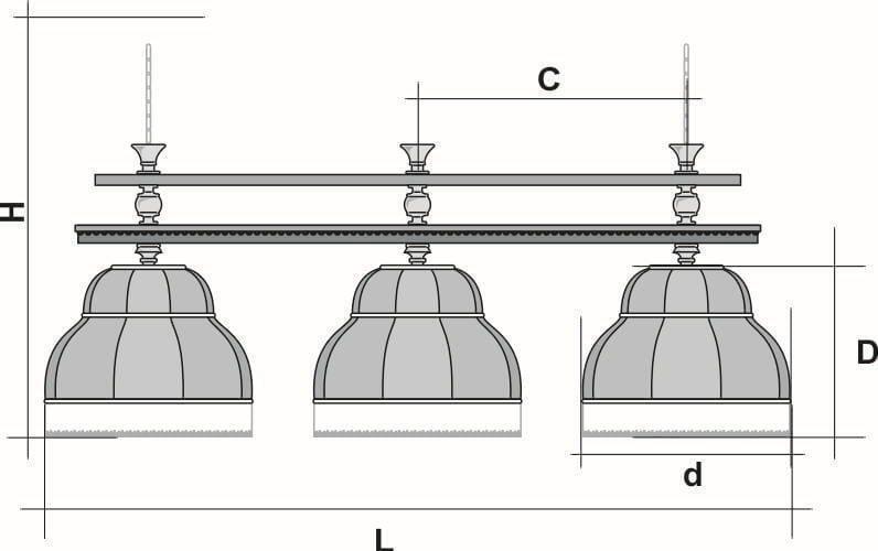 Ни для кого не секрет, что качественное освещение способствует не только хорошей игре, но и не оставляет усталости глаз после продолжительной игры в бильярд. Светильники АРИСТОКРАТ обладают всеми необходимыми характеристиками, чтобы игра в бильярд приносила только удовольствие. Условные схематические обозначения: Н — общая высота светильника / 2065 мм L — общая длина светильника / 1780nbsp;nbsp;мм D — высота плафона / 395 мм d — диаметр плафона / 500 мм C — расстояние между осями / 640 мм
