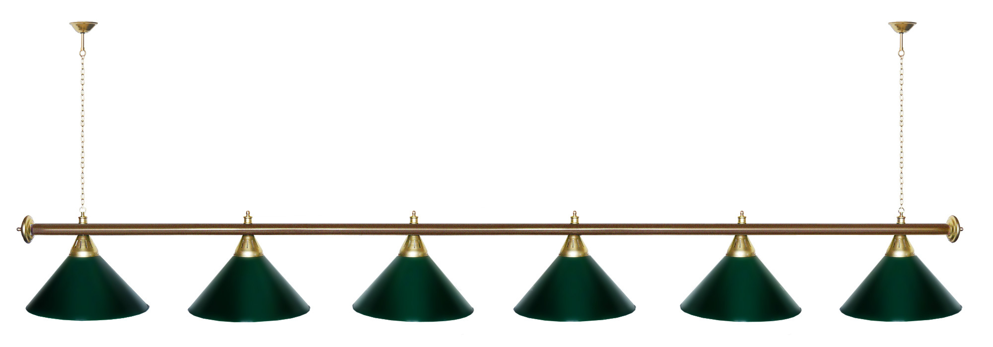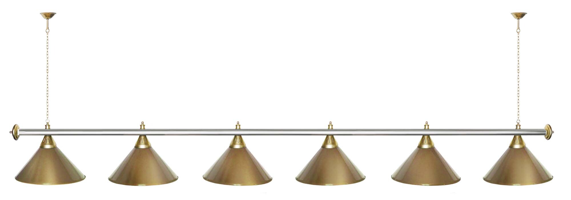 Светильники Startbilliards производства ФС «Горизонт» с 6-ю плафонами комплектуются к столам 12 футов. Укомплектованы цельной металлической штангой с полимерным покрытием. Штанга изготовлена из цельной трубы, что исключает искривление конструкции. Применение керамических патронов #40;Е27#41; увеличивает срок эксплуатации светильника. Металлические плафоны крепятся с помощью зажимных пластин. Длина подвесной цепи 100 см — оптимальное расстояние для расположения источника света над игровым полем стола. В комплект включены две потолочные чашки. Условные схематические обозначения: Н — общая высота светильника / 1420 мм L — общая длина светильника / 2920 мм D — высота плафона / 300 мм d — диаметр плафона / 370 мм C — расстояние между осями / 500 мм Штанга и плафоны поставляются в отдельных упаковках.