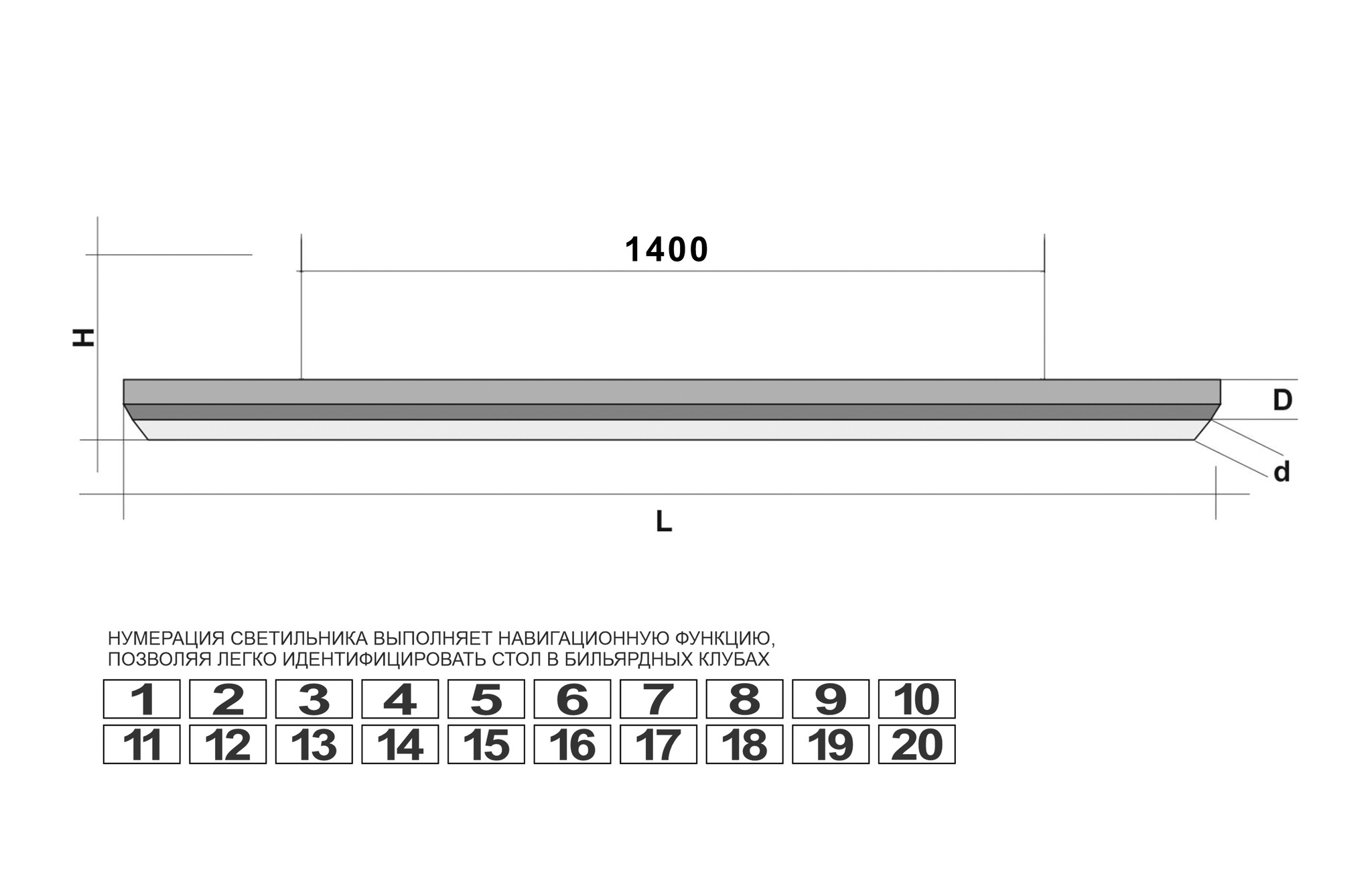 Современная светодиодная лампа «STARTBILLIARDS» Club Select 5 — это идеальное освещение для бильярда, где важна каждая деталь. Инженерная мысль, воплощенная в пяти монолитных секциях, создает сбалансированный световой поток, который равномерно покрывает всю поверхность стола размером 11-12 футов. Мощный светодиодный модуль лампы «STARTBILLIARDS» Club Select 5 дает яркий поток в 5000 люмен с холодным белым светом 6500K без теней и бликов, гарантируя максимальную концентрацию, точную цветопередачу сукна и шаров для исключительно прицельных ударов. Светодиодные панели общей мощностью 250Вт обеспечивают максимальную энергоэффективность и долгий срок службы. Лаконичный дизайн лампы «STARTBILLIARDS» Club Select 5 с безупречными пропорциями и матовыми поверхностями органично впишется в любой интерьер — от строгого клуба до современного лофта. В комплекте идет ярко подсвеченная номерная табличка, интегрированная в узкий торец лампы - важный функциональный элемент «STARTBILLIARDS» Club Select 5. Это решение является не только эстетически привлекательным дополнением, но и выполняет навигационную функцию, позволяя легко идентифицировать стол издалека, что особенно удобно для бильярдных клубов. Условные схематические обозначения: L - Длина светильника: 3020 мм d - Ширина светильника: 640 мм D - Высота светильника: 70 мм H - Длина троса #40;крепление#41;: 2000 мм