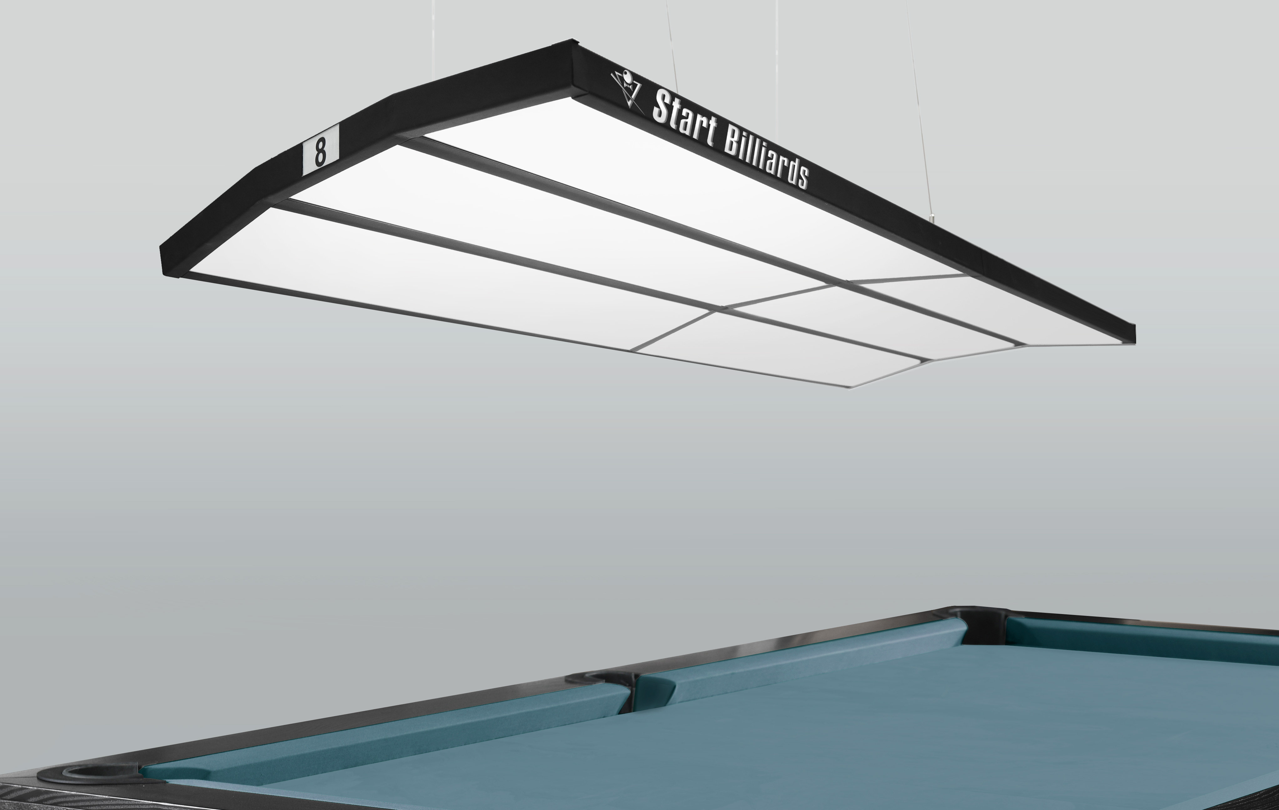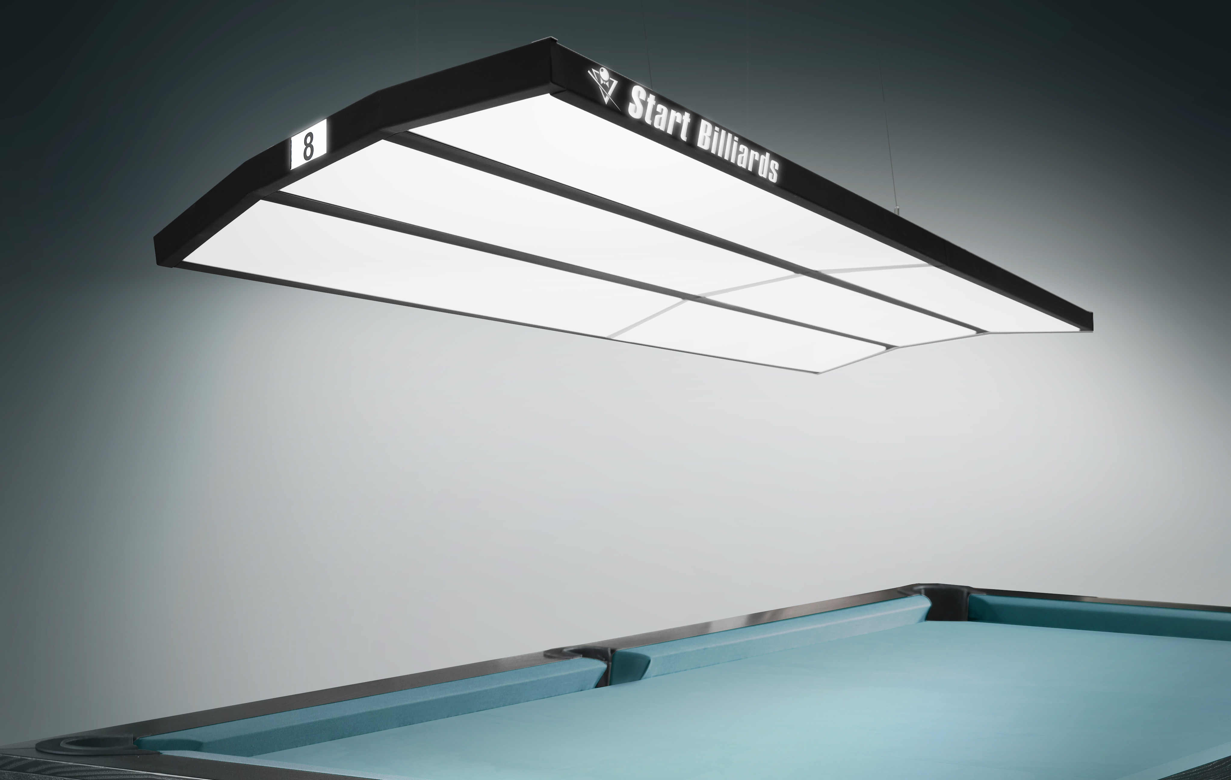 Лаконичный корпус с матовыми поверхностями и уникальной изогнутой геометрией органично впишется в интерьер от строгого классического клуба до стильного лофта. Оба длинных торца лампы украшает светящийся логотип Start Billiards — знак качества, одобренный спортсменами и экспертами.