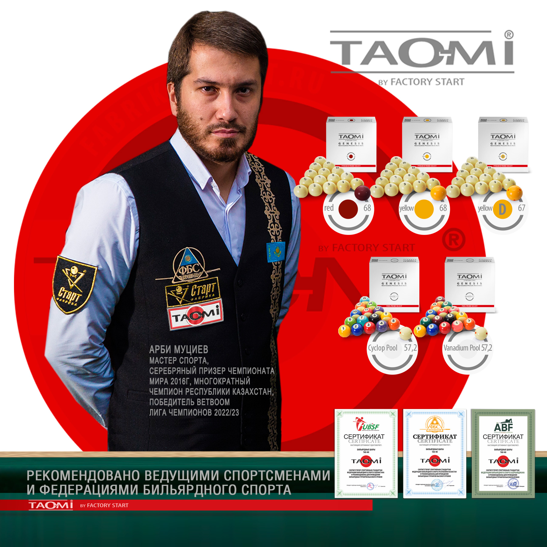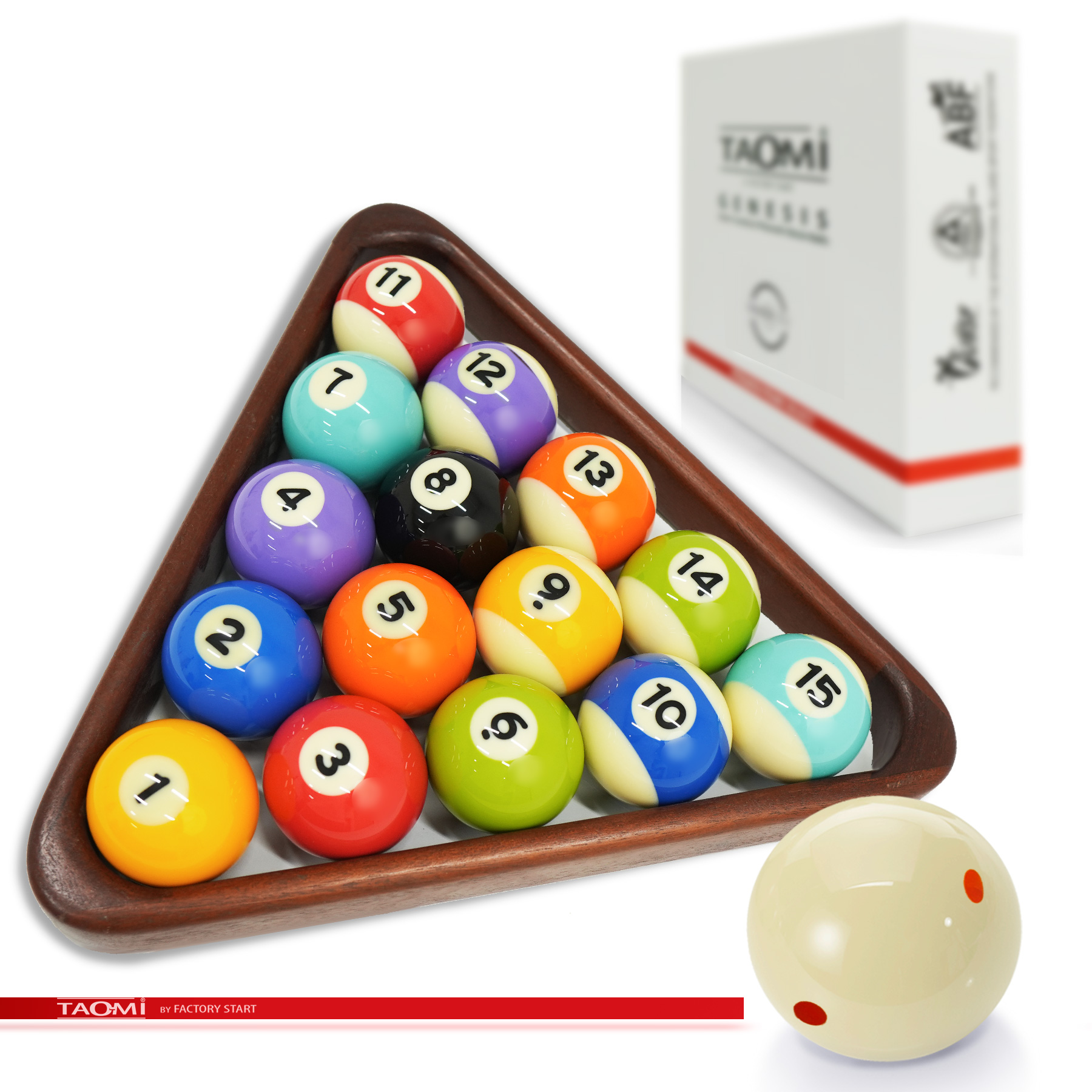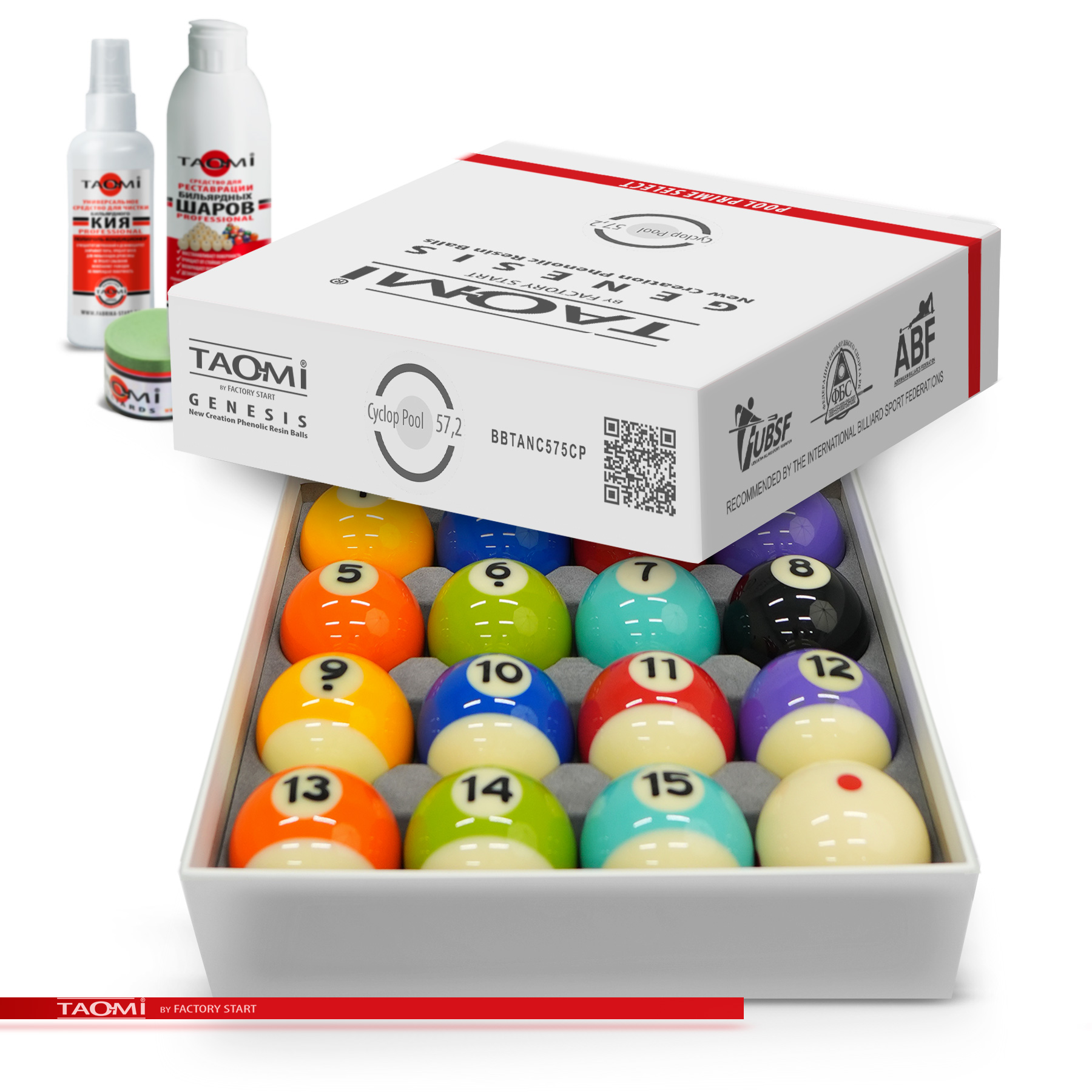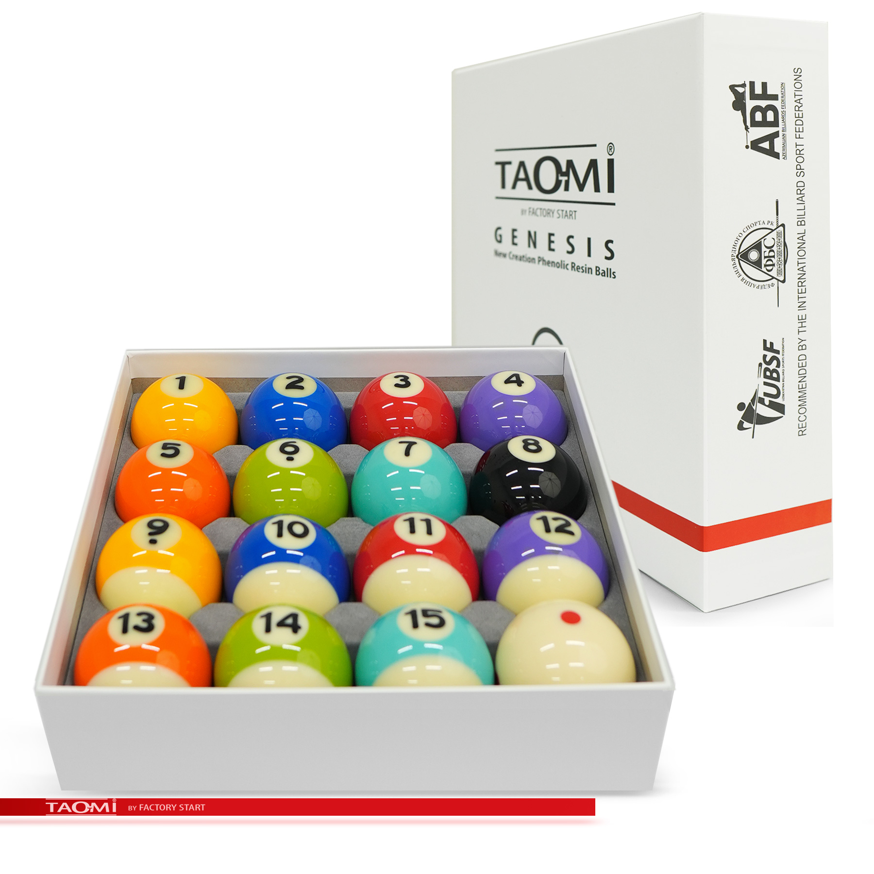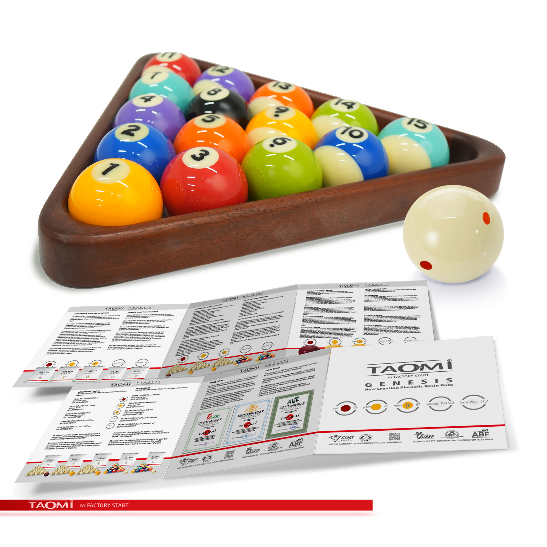 Шары TAO-MI GENESIS С-Pool 57.2 мм – эталон точности и долговечности для игры в американский пул. Продукт нового поколения собственного бренда Фабрики «Старт», изготовленный по запатентованной технологии. Набор шаров из высококачественной фенольной смолы предлагает лучшее соотношение цены и качества для игроков любого уровня. Благодаря передовой технологии производства, включающей многоступенчатую полировку, каждый шар имеет строгий допуск по диаметру #40;57,2 мм#41;, единый стандарт веса #40;разброс 1-2 г#41; и идеальную сферичность для абсолютного контроля над игрой. Сверхтвёрдая поверхность устойчива к царапинам и ожоговым пятнам от ударов. Однородная плотность материала обеспечивает полный контроль над траекторией, скоростью и вращением. Уникальная эластичность смолы даёт оптимальный и предсказуемый отскок. Исключительная прочность шаровnbsp;nbsp;TAO-MI GENESIS С-Pool означает прямую экономию на обслуживании, полировке и замене, а также снижает износ кия за счет мягкого, но прочного взаимодействия с наклейкой. Выдающаяся долговечность, многократно превышающая срок службы шаров из полиэстера, делает шары выгодной инвестицией в репутацию заведения и игровой комфорт. Специально разработанная фенольная смола обеспечивает однородную плотность, высокую ударопрочность и термостойкость для стабильно высоких игровых характеристик на долгие годы. TAO-MI GENESIS С-Pool — это разумный выбор для тех, кто ценит надежность, точность и превосходное качество игры по доступной цене.