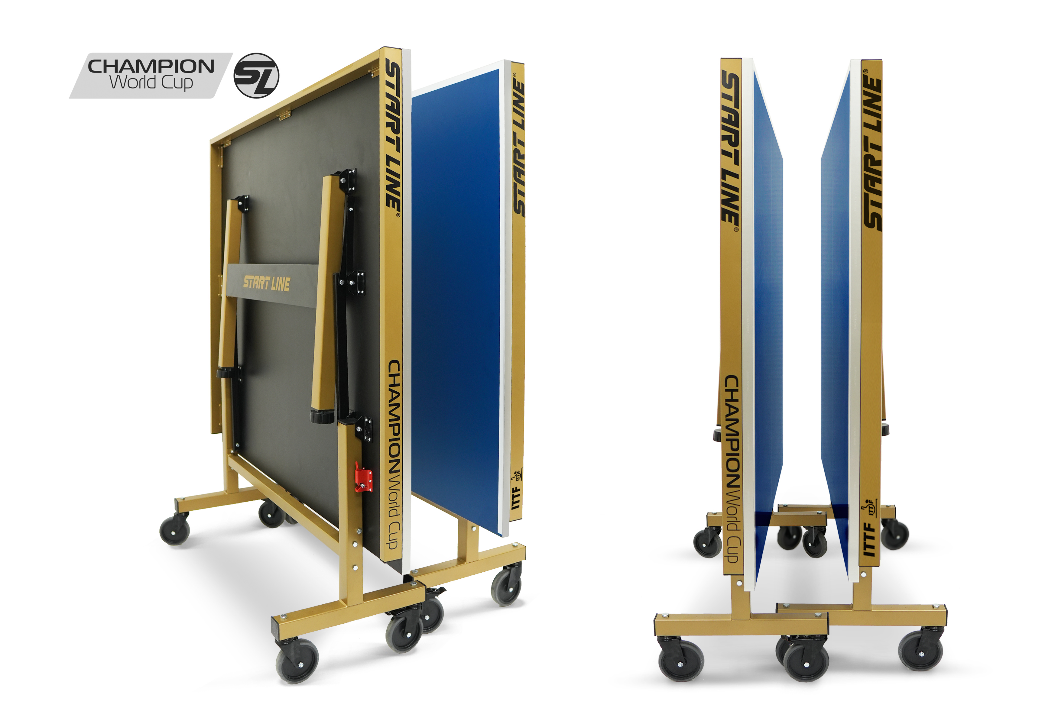 Теннисный стол Champion World Cup — это результат симбиоза многолетнего опыта проведения профессиональных спортивных турниров и технологий передового производства. Теннисный стол Champion World Cup — новое прочтение стола Champion, который сертифицирован ITTF (Международной федерацией настольного тенниса), что подтверждает его соответствие стандартам для проведения профессиональных соревнований. Champion World Cup — это первый в России и странах СНГ стол, спроектированный для комплектации спортивных клубов и проведения профессиональных чемпионатов. Рекомендации топ-спортсменов, учтенные при разработке, гарантируют эргономику модели и игровые характеристики, соответствующие самым строгим мировым стандартам. Инженерам Start Line удалось достичь максимальных игровых показателей в условиях минимальной цены в сегменте. Это стало возможным благодаря локализации производства и стратегическому сотрудничеству с мировыми брендами, включая объединение усилий с ведущим производителем товаров для настольного тенниса — компанией Double Fish. Start Line предлагает две модификации стола на выбор: — Training — оптимальное решение для регулярных тренировок любого уровня подготовки и проведения профессиональных соревнований. — Competition — премиальная версия, представляющая собой настоящий шоу-стол, созданный для того, чтобы стать центральным объектом и эффектным украшением любого турнира! Размер стола в рабочем положении: 274 см в длину, 152,5 см в ширину и 76 см в высоту, что соответствует стандарту ITTF. Стол укомплектован столешницей из прочного материала МДФ толщиной 25 мм с двенадцати слойной антибликовой покраской, что гарантирует предсказуемый контроль над ударами и высокий отскок мяча. Уникальность финального этапа покраски заключается в нанесении лака через специальные вальцы, что создает эффект легкой шероховатости. Это инновационное решение напрямую влияет на сцепление мяча со столешницей, обеспечивая идеальный контроль без потери скорости отскока. Металлический кант 50x25 мм по всему периметру стола и кромка из ПВХ 0,45 мм обеспечивают устойчивость и долговечность стола даже в условиях интенсивной эксплуатации. Стол оснащен усиленной металлической рамой, которая обеспечивает исключительную жесткость конструкции и абсолютную устойчивость во время самых интенсивных розыгрышей. Обрезиненные колеса диаметром 125 мм гарантируют легкость перемещения. На каждой стороне стола установлено четыре колеса, два из которых оснащены тормозом, что гарантирует идеальную фиксацию и стабильность стола во время игры. Регулируемая высота боковых опор дает возможность адаптации стола к различным условиям, позволяя выставить идеальный уровень игрового поля даже на неровной поверхности. Сложить для хранения и разложить стол для игры без труда сможет один человек. Специальные фиксаторы позволяют надежно закрепить положение стола. Конструкцией предусмотрен режим одиночной игры PLAYBACK, который позволит тренироваться самостоятельно, отрабатывая навыки и точность ударов. Champion World Cup — это инвентарь наивысшего класса, который уже сегодня доступен для профессионального оснащения клубов и турнирных площадок. Start Line предлагает лучшую цену на рынке в своем сегменте, сохраняя высочайший уровень игровых характеристик. Более того, модель всегда в наличии на складе, что гарантирует бы